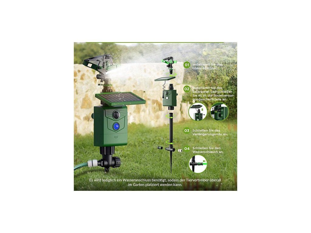 To edinstveno strašilo uporablja najsodobnejšo tehnologijo senzorja gibanja v kombinaciji z visokotlačnim vodnim curkom, ki lahko brez hrupa in toksičnosti zaščiti vaš vrt. Ko senzor zazna gibanje, pošlje usmerjen vodni curek, ki zadene neželenega obiskovalca. Obiskovalec hitro zapusti zaščiteno območje. To učinkovito prepreči vstop živali na zaščiteno območje. Naša naprava deluje kot neprekinjeno odvračalno sredstvo.