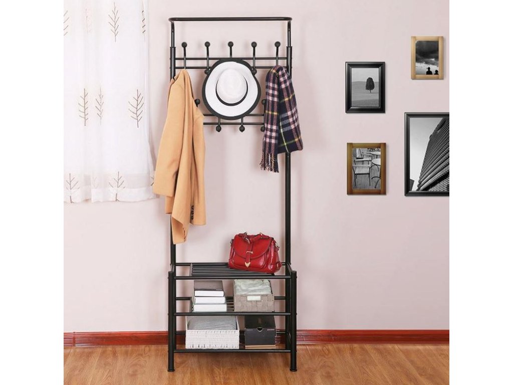 Edinstven sistem tega stojala s policami omogoča popolno organizacijo. Tri stabilne police na dnu se lahko uporabljajo za shranjevanje čevljev, škatel, torb ali nahrbtnikov. Osemnajst kavljev, razporejenih po celotni višini konstrukcije, zagotavlja veliko prostora za obešanje oblačil in dodatkov.