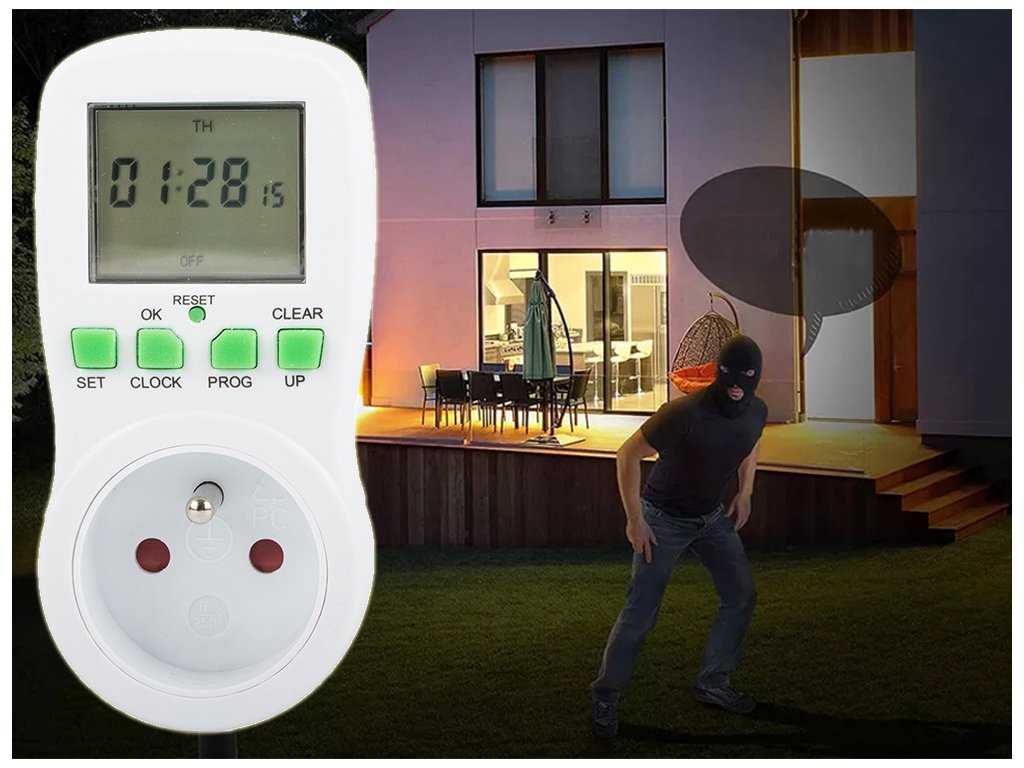Uporaba posebnega časovnika za vtičnice je idealna tudi v času počitnic. Če ne želite, da neznanci vedo, da vas ni doma, preprosto sprogramirajte naše preklopne ure. Tako lahko v svojem domu ob določenem času vklopite ali izklopite luči, televizor, radio, ne da bi bili prisotni. Morebitni tat nima možnosti, da bi opazil vašo odsotnost. Vaš dom bo zaščiten.