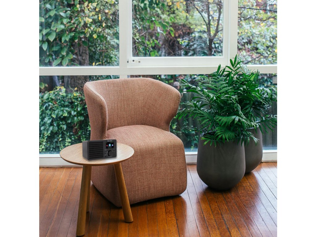 Črna oblika in visokokakovostni materiali dajejo radiu sodoben in eleganten videz. Zahvaljujoč kompaktnim dimenzijam (193,4 x 87,5 x 110 mm) se prilega v vsak prostor – od spalnice do dnevne sobe in pisarne.