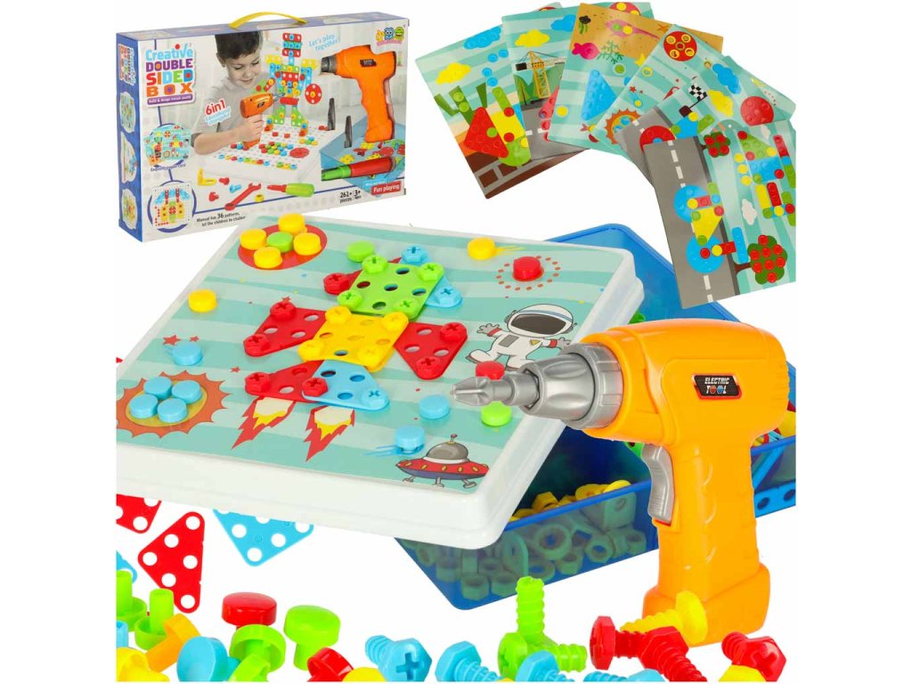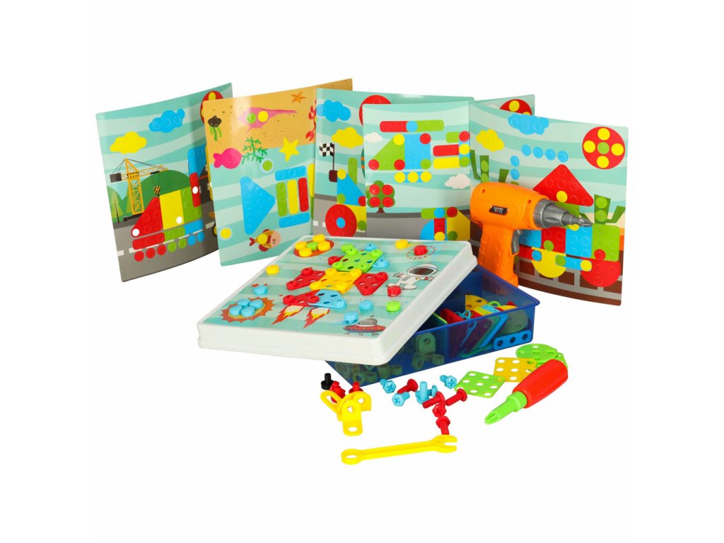 Kreativni gradbeni komplet z vrtalnikom in vijaki pomaga otrokom razvijati fine motorične sposobnosti, potrpežljivost in koncentracijo.